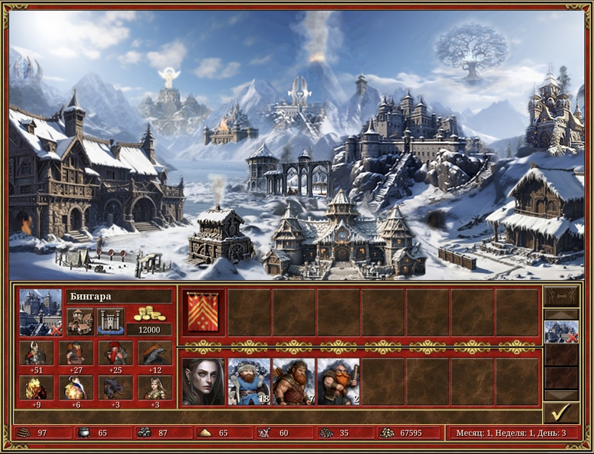 Highlands Town или Высокогорье — город гномов, расположенный далеко в заснеженных горах, отсылает нас к скандинавской мифологии. А ещё лично меня отсылает к фракции Горные Кланы из Disciples 2 — экран города очень их напоминает. Заглавный рисунок очень хорош, не налюбуешься, а музыкальная тема хороша вдвойне. Однако юниты нарисованы средненько — некоторые так вообще страшненькие. В целом фракция Высокогорья хорошо сбалансирована, на мой взгляд, с большим упором в защиту, но при этом не страдает от недостатка боевой мощи. Количество существ седьмого уровня здесь — два, и одновременно их можно построить, как в Фабрике из HotA.