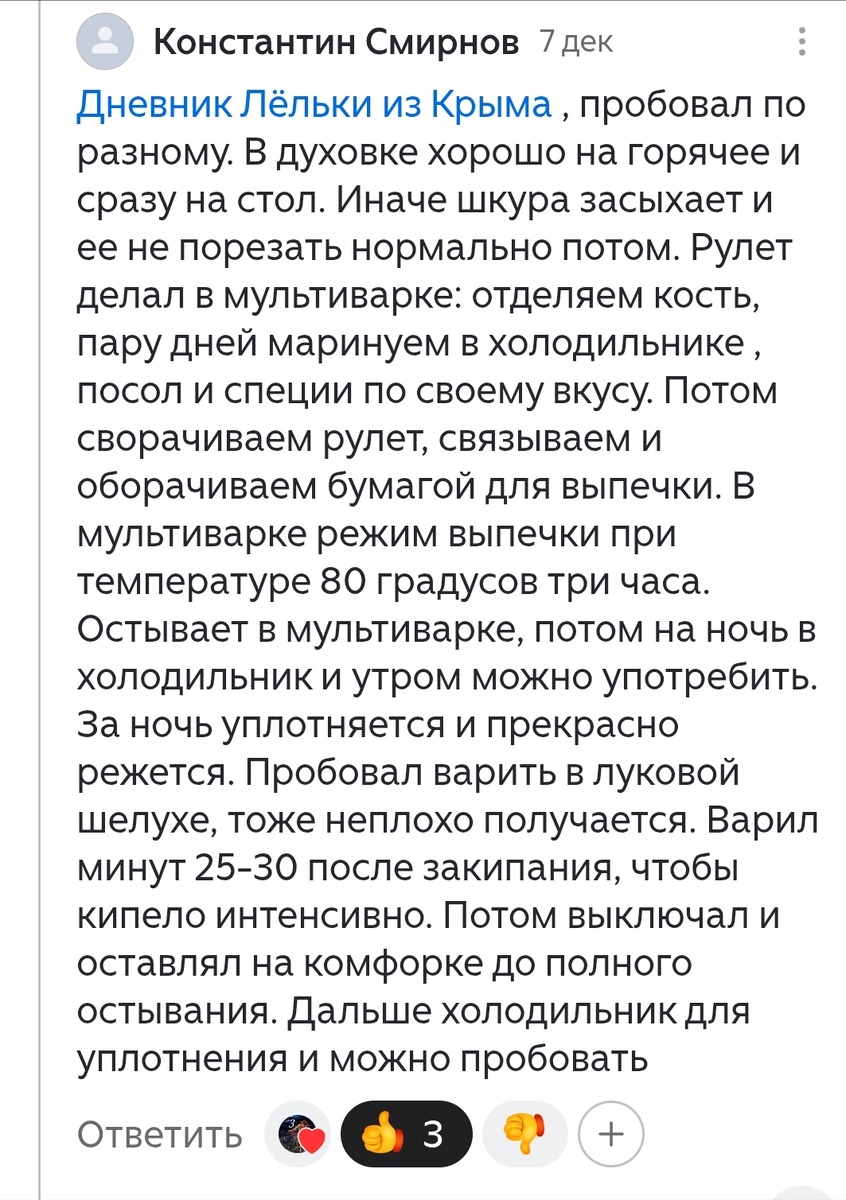 Решила я завести новую рубрику, потому что иногда мои подписчики дают очень хорошие советы и мне не хочется их терять. А еще хочу сказать, что я прислушиваюсь достаточно часто к вашим советам. В этой рубрике будут не только рецепты, а вообще всё, что я делала по вашим советам и от чего получаю результат, сегодня же будет рецепт и мой отчет))). Суть в том, что я 30 лет не ела свинину и вдруг меня пробило, уже мясяца два готовлю из нее и даже взяла на праздники рульку. Так как рулька большая, мне ее сразу разрубили на три части и из верхней я решила приготовить что-то интересное (две другие на холодец пойдут). Как вы понимаете, опыта в приготовлении рульки у меня ноль, можно было бы в интернете посмотреть, но если у меня есть подписчики, к которым доверия больше, чем к интернету, то почему бы не воспользоваться знакомствами?)))) В общем, я спросила и мне ответили Огромное спасибо! Потому что, если б не совет подписчика, то я бы запекла и это был бы не лучший вариант, а так я приготов
