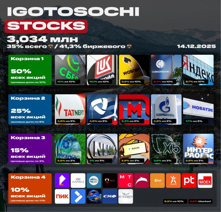 Ёлка наряжена, снег наконец-то добрался и до Москвы, даже на улицу выйти приятно стало, и не менее приятно посмотреть, как себя чувствует портфель акций и поделиться новостями. Посмотрел, как идут успехи у портфеля в целом и целевых значений всех акций в отдельности. Размер портфеля составляет 3,034 млн рублей. ⏳ Предыдущий срез был 2 декабря. Акции занимают 35% от всего портфеля (актуальный отчет будет 1 января, не пропустите). Подписывайтесь и на мой канал в Дзене тоже! Тут новые публикации выходят раньше всего, и вы ничего не пропустите! Если взять только биржевой (без депозитов), это 41,3%. Целевая доля акций в биржевом портфеле 40%, реальная чуть выше. 🧮 Учёт веду в специальном сервисе, куда агрегируются все счета. 🛍 Изменения в портфеле акций в первой половине декабря такие: Роснефть — 40 акций Совкомбанк — 1 000 акций НЛМК — 50 акций Интер РАО — 2 500 акций Газпром нефть — 20 акций Татнефть-ап — 15 акций Потратил на акции около 60 тысяч рублей. Про все покупки первой полови