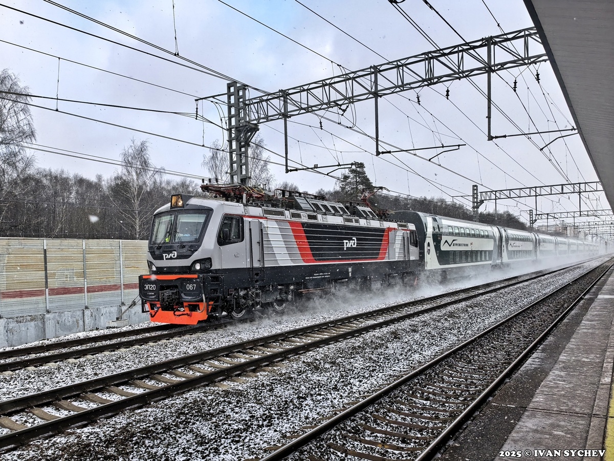 1. Для начала мимо меня (и мимо Ольгино, само-собой) пролетел «Буревестник», ведомый электровозом ЭП20-067, который окрашен то ли в новый корпоратив РЖД, то ли под цвет «Буревестника». Просто в такой же окраске видели ЭП20 в Екатеринбурге, где нет «Буревестника» и быть не может.