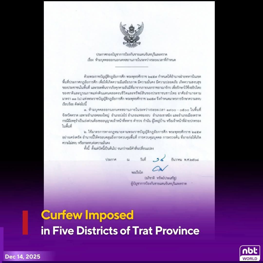 Командование пограничной обороны Чантабури-Трат объявило о введении комендантского часа, вступающего в силу немедленно, в пяти районах провинции Трат для поддержания общественного порядка и безопасности. Указ запрещает гражданам покидать свои дома с 19:00 до 5:00 в районах Клонг Яй, Бо Рай, Лаем Нгоп, Кхао Саминг и Муанг Трат. Лица, нуждающиеся в срочном освобождении, должны получить разрешение от военнослужащих или полицейских, глав районов, старост деревень или местных административных чиновников. На момент комендантского часа будут применены строгие меры по обеспечению соблюдения "Закона о военном положении 1914 года", включая территориальный и индивидуальный контроль, а также проверки, необходимые для предотвращения беспорядков или угроз национальной безопасности. Королевский военно-морской флот Таиланда убедительно просит общественность о сотрудничестве и строгом соблюдении данных мер, а также рекомендует гражданам следовать информации из официальных правительственных источнико
