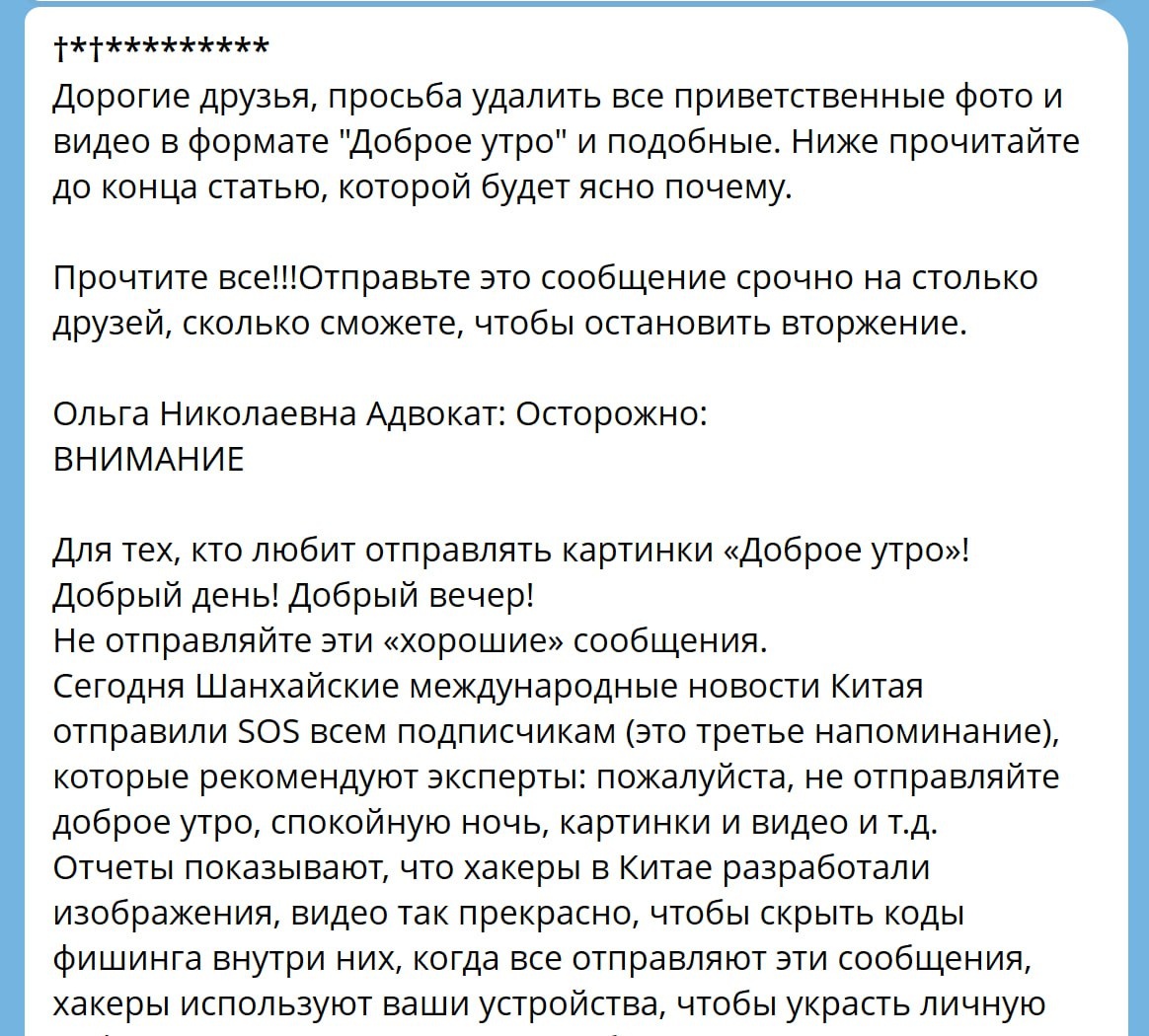 ⭐️ФЕЙК и типичная «цепочка страха» ВНИМАНИЕ: В сети ходит фейковое предупреждение про картинки «Доброе утро» Только что многим пришло сообщение: «Не отправляйте доброе утро, хакеры в Китае вшивают в картинки вирусы!». Это ложь и паника. Коротко по фактам: ✅ Обычные фото и видео в мессенджерах не могут сами по себе украсть данные карт или взломать телефон. ❌ Но опасно переходить по ссылкам из подозрительных сообщений и скачивать файлы (.exe, .apk). 🔍 Такие рассылки создают, чтобы вызвать хаос и заставить вас массово пересылать ерунду. Что делать? — Игнорируйте такие панические цепочки. — Не пересылайте их дальше — этим вы только помогаете фейку. — Проверяйте источники они должны быть официальные, а не придуманные «Шанхайские новости», «адвокат Ольга Николаевна». А для реальной безопасности в Telegram: 1. Включите Облачный пароль (Настройки → Конфиденциальность → Пароль). 2. Добавьте двухэтапную аутентификацию. 3. Проверяйте активные сессии и выходите с незнакомых устройств. Н
