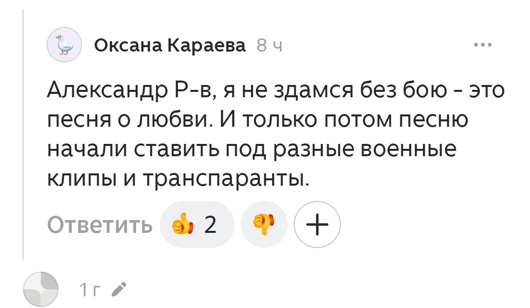 Публикация создана по мотивам полученного недавно комментария в Дзене (текст комментария прикреплен). Это свежий комментарий к одной из моих давних публикаций, речь в которой шла про Святослава Вакарчука из "Океана Эльзы" - видного (потомственного, что важно) украинского националиста - и его песню. Почти четыре года войны, огромное количество трагедий потерь, десятки откровенно террористических актов - и вот, пожалуйста. Находятся люди, которые почему-то о любви слушают из уст того, кто всё это против нас поддерживает. И сам автор первый ставит свою песню под соответствующие транспаранты. Он сам, своими руками. А не кто-то против его воли. А что, больше некого послушать о любви? Мне вот что непонятно. Как будто бы выбор поставлен так, что либо Вакарчука о любви слушать, либо вообще ничего не слушать о любви. Ну это же не так. В мировой культуре накоплено огромное количество песен о любви. На любой вкус. Нет необходимости, подобно тем мышам из анекдота, "плакать и колоться", но про