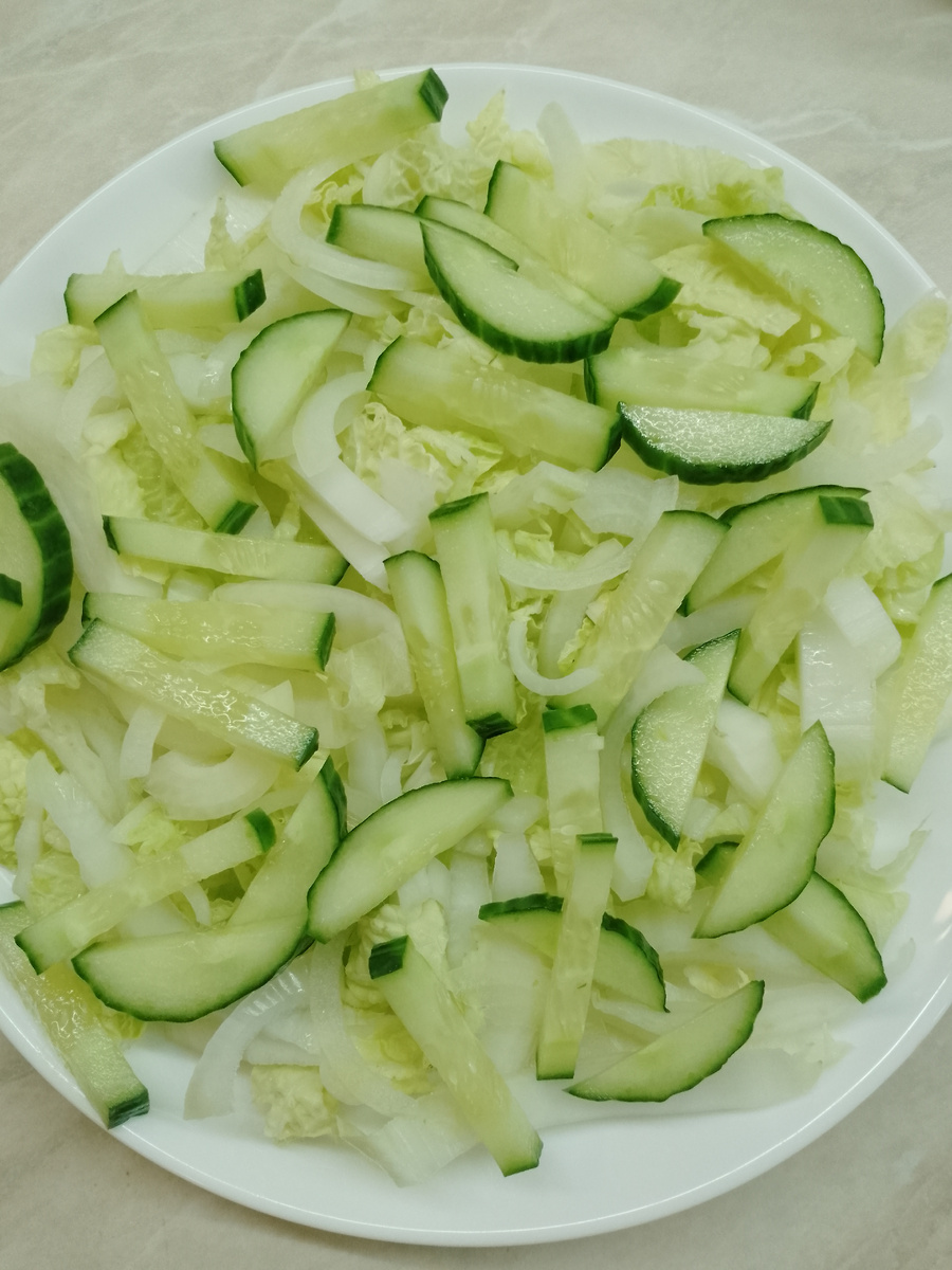 Салат без майонеза и сметаны. Простой, вкусный, не каллорийный. Количество ингредиентов можно варьировать под свой вкус. Режем пекинскую капусту и свежий огурец. Форма нарезки на Ваш вкус. Далее нарезаем куриную грудку. Соль, перец по вкусу. Сбрызгиваем растительным маслом. Выкладываем фасоль. Я выкладываю сначала фасоль с помощью шумовки, а потом уже поливаю томатным соусом из банки. Таким образом контролирую количество заправки салата, что бы он "не уплыл". Завершаем приготовление салата добавлением свежей зелени. У меня укроп и петрушка. Приятного аппетита! Готовьте с удовольствием! Удачи!