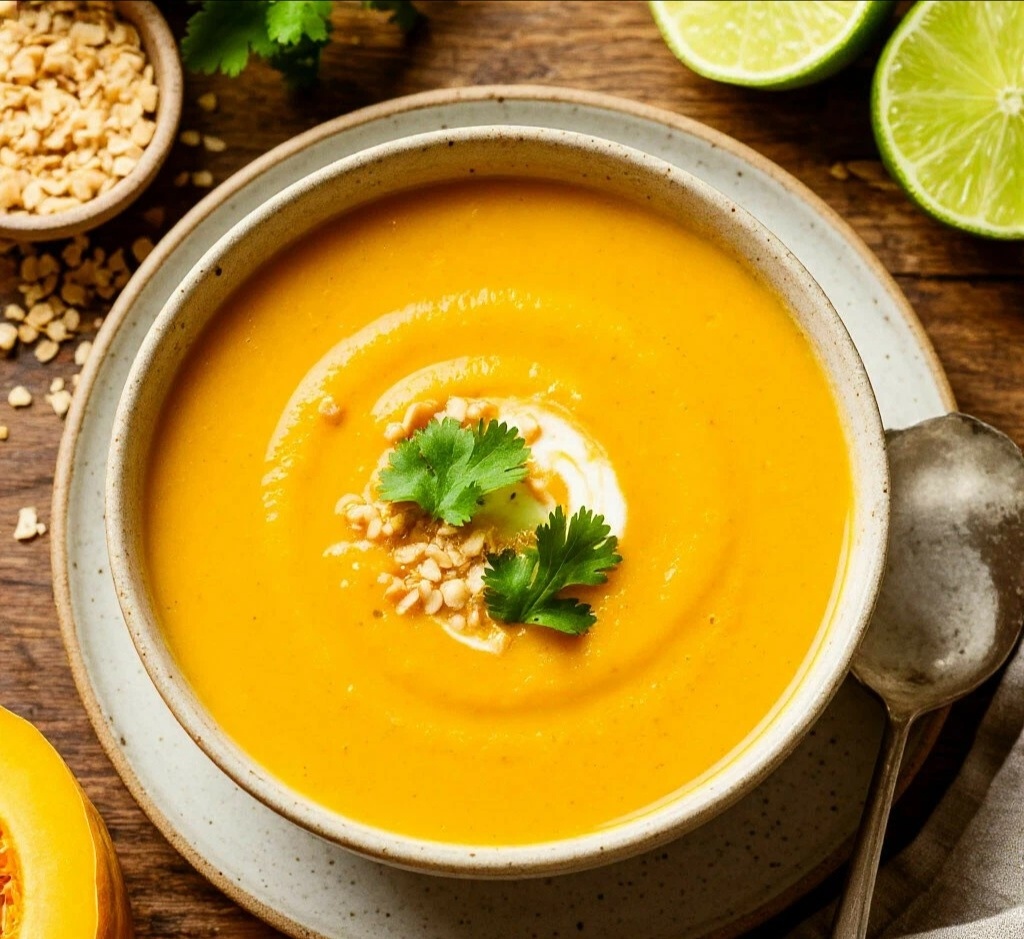 Суп: ПРЯНЫЙ ТЫКВЕННО-КОКОСОВЫЙ СУП-ПЮРЕ С ИМБИРЁМ И ЛАЙМОМ Мяу, мои мечтатели о тёплых странах и пряных ароматах! 🐱🎃 Если за окном слякоть и хочется согреться изнутри, этот суп — ваш лучший друг. Кремовый, бархатистый, с нежным вкусом тыквы, сладостью кокоса, жаром имбиря и освежающей кислинкой лайма. Он обнимает вас своим вкусом и дарит ощущение полного уюта. Готовится в одной кастрюле! 🥣✨ ИНГРЕДИЕНТЫ (на 3-4 порции): 🧾 ·Тыква очищенная (мускатная или обычная) – 400 г 🎃 ·Кокосовое молоко (из банки) – 200 мл 🥥 ·Бульон (овощной/куриный) или вода – 300-400 мл 🍲 ·Имбирь свежий – кусочек 2 см ·Лук репчатый – ½ шт. 🧅 ·Чеснок – 1 зубчик ·Сок ½ лайма 🍋 ·Соевый соус – 1 ст.л. ·Специи: молотый кориандр – ½ ч.л., кайенский перец – щепотка (или по вкусу) ·Растительное масло – для обжарки ВРЕМЯ ПРИГОТОВЛЕНИЯ: ⏰ 30 минут СЛОЖНОСТЬ:🐾 Справится любой котик ПОШАГОВЫЙ РЕЦЕПТ: 👩🍳 1. Подготовка: 🔪 Лук, чеснок, имбирь мелко нарежьте. Тыкву очистите от кожуры и семян, нарежьте небольшим