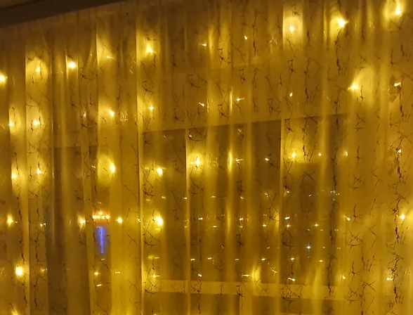 Кстати, в этом году я придумала себе традицию - каждый месяц заказывать одну небольшую вещь для себя. Что-то символичное, чтобы поставить галочку «я о себе позаботилась» или «я себя порадовала», в пределах 500-600 рублей, максимум - 1000 р. Сын то конструктор просит, то что-то для игр: флешку, недорогие наушники. Муж и так вечно заказывает для машины какие-то прибамбасы: лампочки в фары, дворники. Решила и про себя не забывать. В ноябре сумку выбрала, к примеру. Но в декабре никак не могла придумать, что хочу. И вот вчера заметила на Ozon гирлянду-занавес на окно с жёлтыми огоньками. Понравилось, что свет теплый, разные размеры, можно подобрать подходящий и в мою спальню, где высота до карниза 240 см, и в гостиную, где до потолка от пола - 260 см. Решила заказать, в прошлом году у сестры мужа в гостях висели подобные занавесы, смотрелись уютно, а мерцание не раздражало весь вечер.