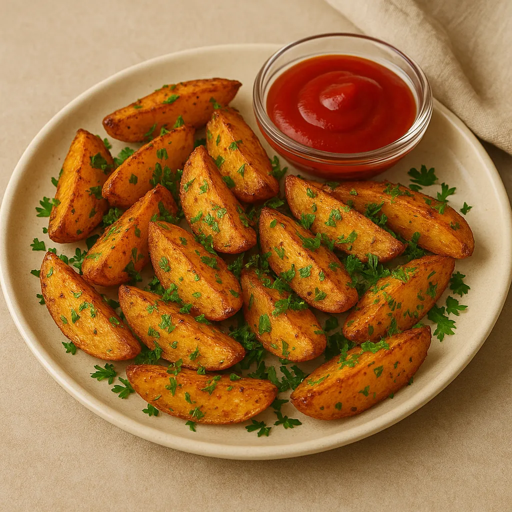 которая получается румяной снаружи и мягкой внутри — без лишних ингредиентов и заморочек. 🛒 Ингредиенты (на 3–4 порции) Картофель — 1 кг Растительное масло — 3 ст. л. Соль — 1 ч. л. Паприка — 1 ч. л. Чеснок сушёный — ½ ч. л. Чёрный перец — по вкусу Сушёные травы (по желанию) — ½ ч. л. 👉 Важно: картофель чистить не обязательно, если кожура тонкая. 🔪 Как подготовить картошку Картофель хорошо вымой. Разрежь каждую картофелину на 6–8 долек (как в кафе). Сложи в глубокую миску. Картошка должна быть одинакового размера, тогда она пропечётся равномерно. 🍳 Как приготовить картошку по-деревенски в духовке Добавь к картошке масло, соль и все специи. Хорошо перемешай руками, чтобы каждая долька была покрыта маслом. Выложи картошку в один слой на противень.