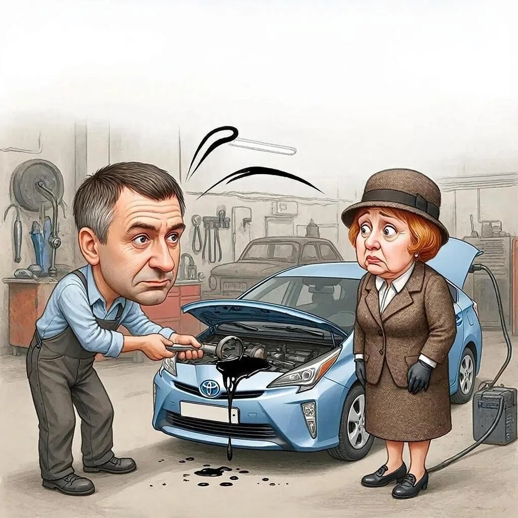 Он молча подошёл к Prius, приоткрыл капот, заглянул внутрь и замер. Его палец, чёрный от мазута, медленно, как стрелка детектора лжи, указал на масляный щуп. «Сударыня, - спросил он голосом, каким, наверное, разговаривают с детьми, нашедшими папину бритву. - А не вспомните ли вы, когда в последний раз интересовались состоянием моторного масла в этом… э-э-э… аппарате?»