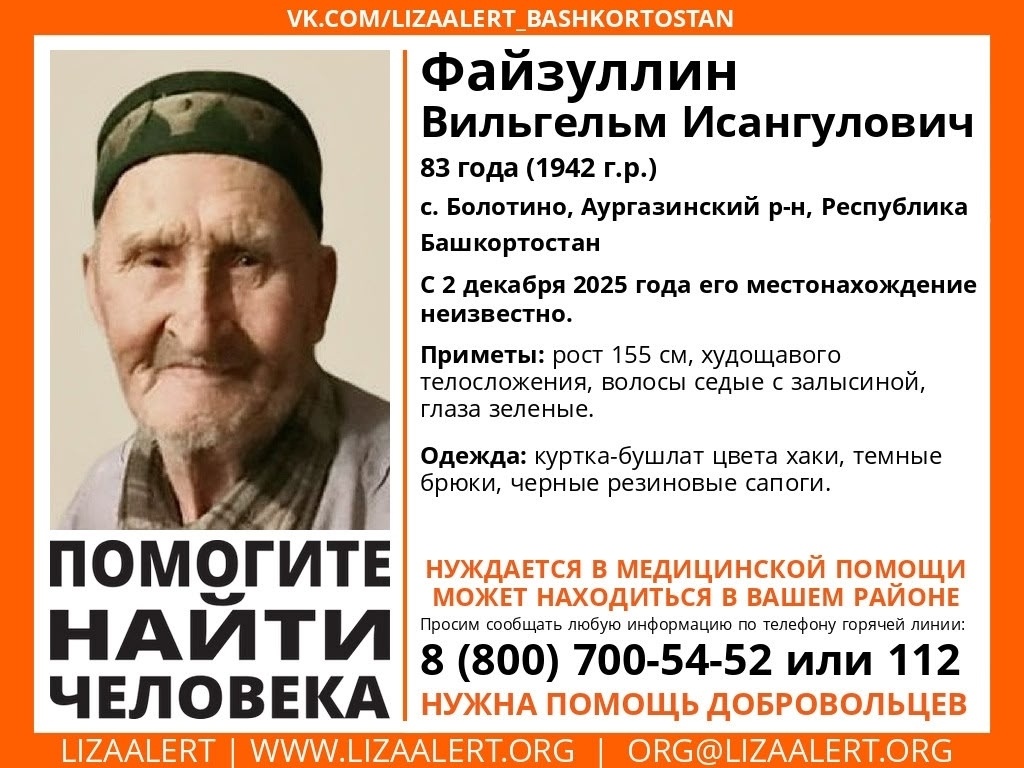 Со 2 декабря ведутся поиски 83-летнего Вильгельма Файзуллина - жителя села Болотино Аургазинского района. По информации отряда «Лиза Алерт РБ», мужчина был одет в бушлат цвета хаки, тёмные брюки и чёрные резиновые сапоги. Мужчина ростом 155 см, с худощавым телосложением, седыми волосами с залысинами и зелеными глазами нуждается в медицинской помощи. Сообщать любую информацию по телефонам: 8 (800) 700-54-52 или 112.