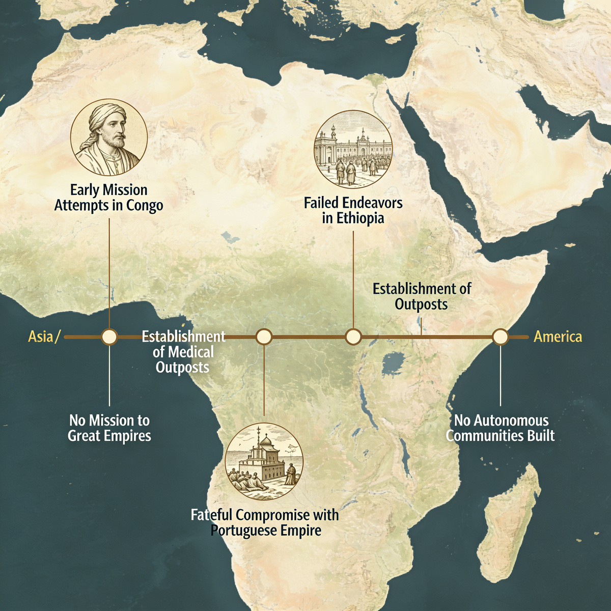Миссия иезуитов в Африке — самая долгая, прерывистая и, возможно, самая трагичная в их истории. Она не имеет единого сюжета, подобного Китаю или Парагваю, а распадается на отдельные, часто незавершенные эпизоды, отмеченные героизмом, провалами и непреодолимым барьером — работорговлей, в которую они были втянуты и против которой чаще всего бессильно протестовали. Их история на континенте началась почти сразу после основания ордена, но развивалась иначе, чем в Азии или Америке. Это не была миссия к великим империям (хотя были попытки в Конго и Эфиопии) и не строительство автономных общин. Это была история точечного проникновения, медицины и рокового компромисса с Португальской империей. Ранние попытки и «потерянное королевство»: Конго и Эфиопия. Ещё в 1540-х годах иезуиты прибыли в Королевство Конго, которое уже было христианизировано португальцами. Они пытались создать здесь оплот цивилизованного христианства, открывали школы, где сыновья местной знати учили латынь. Но их миссия была н