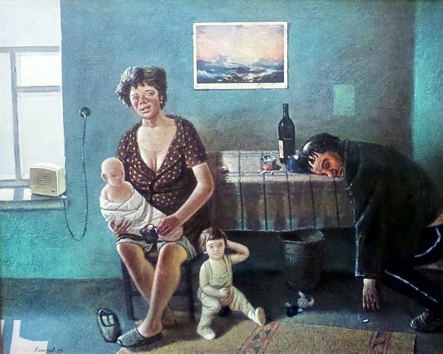 В официальной живописи позднего СССР человек почти всегда был либо героем, либо счастливым участником большого исторического процесса. Он строил, побеждал, улыбался — и никогда не оставался один на один со своей бедой. Картина Василия Колотева «Девятый вал» разрушает эту иллюзию с почти физической точностью. Она не спорит с лозунгами — она просто показывает то, о чём предпочитали не говорить. Комната тесна и узнаваема до боли. Типовая кухня, низкий потолок, тяжёлый воздух, будто застоявшийся не только от табачного дыма, но и от многолетнего молчания. За столом — мужчина в запойном забытьи. Он сидит так, как сидят люди, у которых уже не осталось ни сил оправдываться, ни желания что-либо менять. Это не падение — это дно, принявшее форму привычки. Рядом — женщина. И именно в ней сосредоточено главное напряжение картины. Она не кричит, не плачет, не размахивает руками. Колотев лишает зрителя привычных эмоций, оставляя только сдержанное, почти окаменевшее отчаяние. В её фигуре чувствуетс