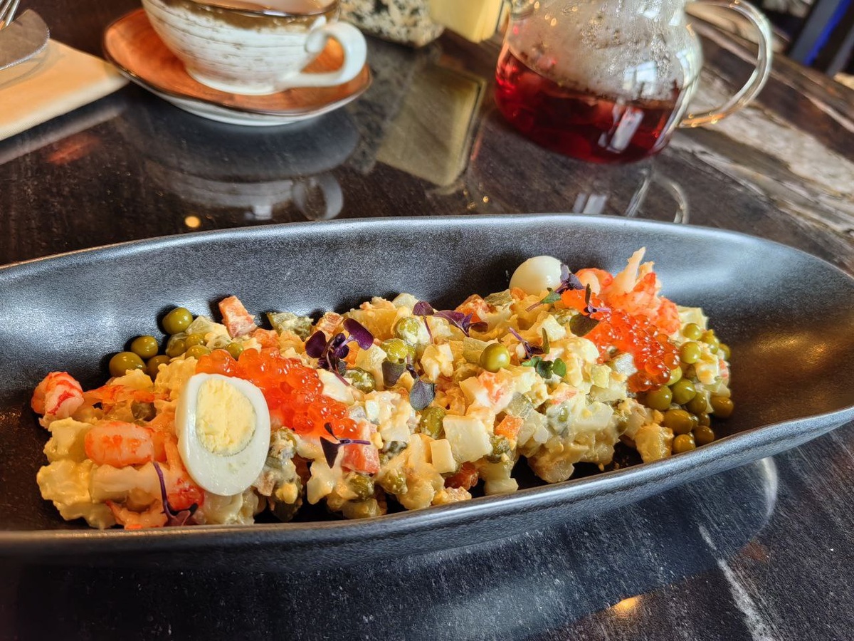 Все кругом уже новогоднее – украшенные елки, гирлянды и волшебное оформление улиц. Полки магазинов заставлены подарками и продуктами к новогоднему столу. Все это можно заказать также готовое с доставкой на дом – экономия времени очень кстати. У ресторанов тоже есть предновогодние сюрпризы. Приходить в ресторан Rizz на обед - удовольствие. Есть у меня много любимых блюд, которые всегда идеальны по вкусу, приготовлены из свежайших продуктов и радуют восхитительной подачей. Меню ресторана постоянно обновляется и, конечно, интересно попробовать новинки. Сегодня, в выходной день, как раз появился повод снова посетить ресторан – к новогодним праздникам для гостей разработали спешл меню. Новогодний салат Оливье предлагается в новой вариации - с креветкой и раковыми шейками. Свежий оригинальный вкус салата покорил – икра добавляет наслаждения и пикантности, а раковые шейки изысканности и яркости. Эффектно и очень вкусно. Оладьи из цукини с мясом краба стригуна под икорным соусом – прекрас