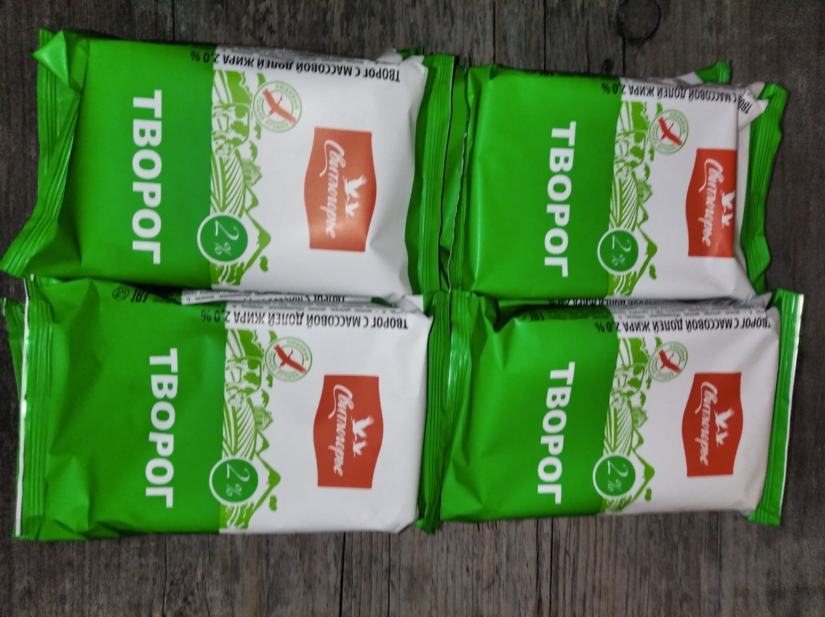Творог Свитлогорье 2% 41,5 рубль/180 грамм, творог Самокат 9% 40 рублей/200 грамм, творог Простоквашино 2% 50 рублей/200 грамм.
