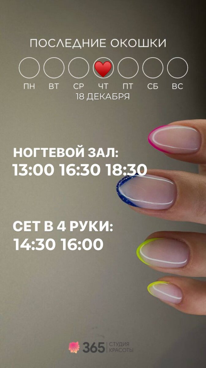 🥰⭐️ Наслаждайтесь профессионализмом, комфортом и гармонией 💫 Запишитесь на наши услуги и почувствуйте себя великолепно ✨💖 #команда365 #красота #наслаждение #забота #зима #любовь #мечтысбываются #радость #возможности ЧТО МОЖНО УСПЕТЬ СДЕЛАТЬ 18 декабря 2025 года : Ногтевой зал: 13:00 16:30 18:30 Сет в 4 руки: 14:30 16:00 Парикмахерский зал: 10:00 14:00 Оформление бровей и ресниц: ближайшая запись на 20 декабря Косметология/шугаринг: ближайшая запись на 25 декабря ЗАПИСАТЬСЯ МОЖНО ЛЮБЫМ УДОБНЫМ СПОСОБОМ: 👉🏻 Сообщение в Whats'app https://wa.me/79663654477 👉🏻По телефону +79663654477 👉🏻Онлайн запись https://n286444.yclients.com/ #команда365 #красота #наслаждение #забота #зима #декабрь #любовь #мечтысбываются #радость #возможности
