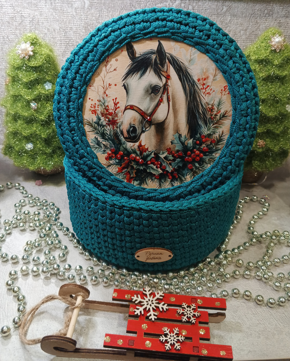 Корзинок навязала много, почти все продала, но эта мне больше всех понравилась, но не уверена была что раскупят , и связала только одну. Вязать корзинки одно удовольствие, сразу видишь результат. А эту с лошадкой тоже одну сделала, тяжело было подобрать цвет для шнура. Просто милота, для подарка отличная идея. Но фаворитом оказалась эта девочка с лошадкой, ещё добавила страз, и получилось очень мило. Пришлось ещё докупать донышки и шнур, так как заказали ещё. Так же понравились всем корзинки с шишками, нашла сначала круглые, а потом попались квадратные, и они тоже нашли хозяев. Они оказались более вместительными. В прошлом году я экспериментировала с техникой декупажа. У меня осталось одно донышко , и я тоже решила его использовать. В результате получилась очень нежная корзинка. А корзинки - ёлочки, вообще оригинальный подарок. Вот чем я занималась, время ушло немало, но когда начинаешь делать фото, видео, прям удивляешься сама на себя, неужели я это сделала, смогла. Пишите ко