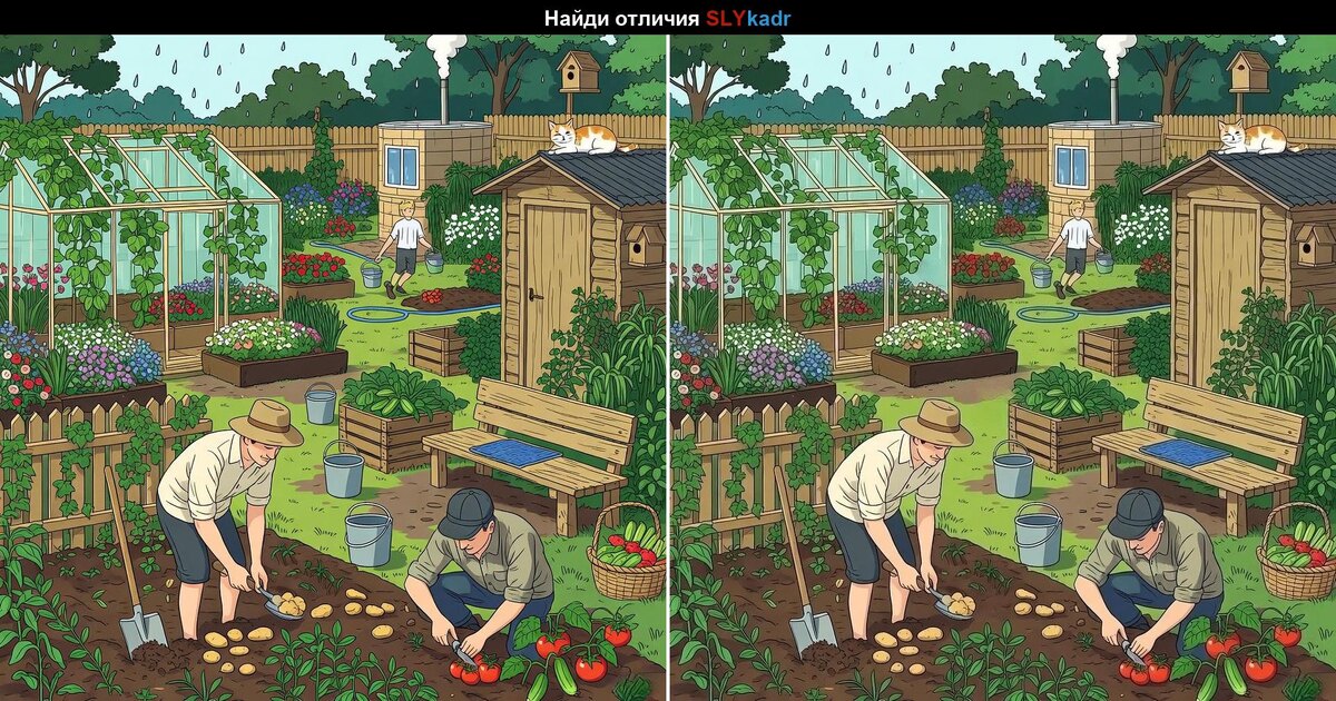 Сегодня приглашаем вас в уютный сад, где кипит работа и зреет богатый урожай. Но не всё так просто — на двух почти одинаковых картинках спрятались отличия. Ваша задача — внимательно рассмотреть каждую деталь и найти их все. Готовы проверить свою внимательность? Тогда начинаем! Ну как, удалось найти все отличия? ✨