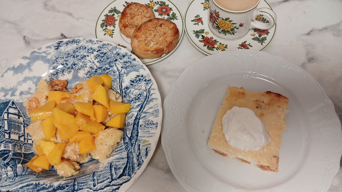 В декабре мы питаемся на сумму меньше, чем прожиточный минимум, это 288 руб в день на человека. Это 85% от суммы ПМ Завтракаем пшенной кашей с курагой и творожной запеканкой. Пшенная каша на топленом молоке, готовила ее в горшочках в духовке. Сверху в тарелки еще манго добавила. Творожная запеканка с курагой со сметаной кофе и нарезное печенье с арахисом. Весь завтрак готовила вчера Обед такой же, как накануне: суп-пюре из цветной капусты, только сегодня добавила немножко сливок, и копченая скумбрия. Ели ее с домашним хлебом На десерт - чашечка эспрессо, печенье и хурма Сегодня перед обедом еще заехала по дороге домой в Ростикс и взяла бесплатный ай-ролл 😄 Ужинали тушеными куриными желудочками, у меня с цветной капустой, у мужа еще рис на гарнир был и потом я кефир пила с мандарином, муж пил чай с бутербродами с сыром Меню год назад