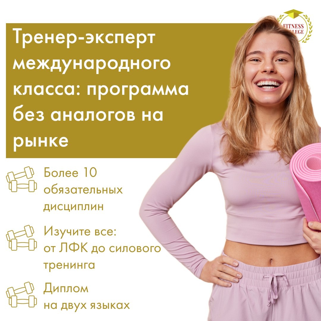 Тренер-эксперт по фитнесу международного класса — программа, которой нет аналогов в индустрии фитнес-образования. ✅ 250+ тем и 25 дисциплин. вы изучаете весь спектр практических и теоретических компетенций, необходимых профессионалу мирового уровня: 🤍 анатомия, физиология, биомеханика, спортивная медицина, спортивная биохимия; 🤍 фитнес-нутрициология и рациональное питание; 🤍 персональный тренинг на продвинутом уровне; 🤍 тренажёрный и групповой тренинг; 🤍 оздоровительные методики ✅ Гибкая структура обучения дистанционно, очно, заочно и экстернат — можно выбрать формат, который подходит именно вам. ✅ Практика + теория. 10 семинаров, 13 мастер-классов, целая база практических материалов, авторские пособия и видео-лекции, возможность включить дополнительные дисциплины. ✅ Поддержка 24/7. личный наставник, куратор, доступ к обширной базе знаний, которая остаётся с вами навсегда. ✅ Международный уровень документа. двуязычный диплом (русский + английский), законное свидетельство для