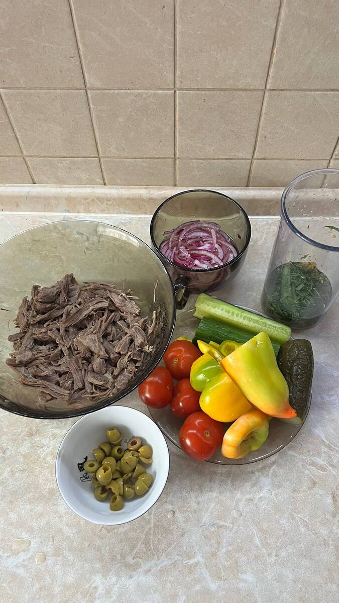 Салат с говядиной и овощами. Говядину можно заменить свининой или языком. Но как я говорила, что сварили, то и используем. У меня здесь примерно 350 гр отварной говядины, 200 гр болгарского перца и по 150 гр огурцов (люблю добавить солёных огурцов тоже) и томатов. Лук красный около 50 гр я замариновала в уксусе с водой и сахаром. Оливки грамм 30. Всё это режем соломкой (к общему виду длинных волокон мяса). Соус для салата из растительного масла, зелени, горчицы зернистой и столовой, сока лимона (всё по столовой ложке) и раздавленного 1 зубчика чеснока. Салат заправляем всем этим соусом, доводим до вкуса солью, перцем желательно свежемолотым. #рецепты@tkprofood