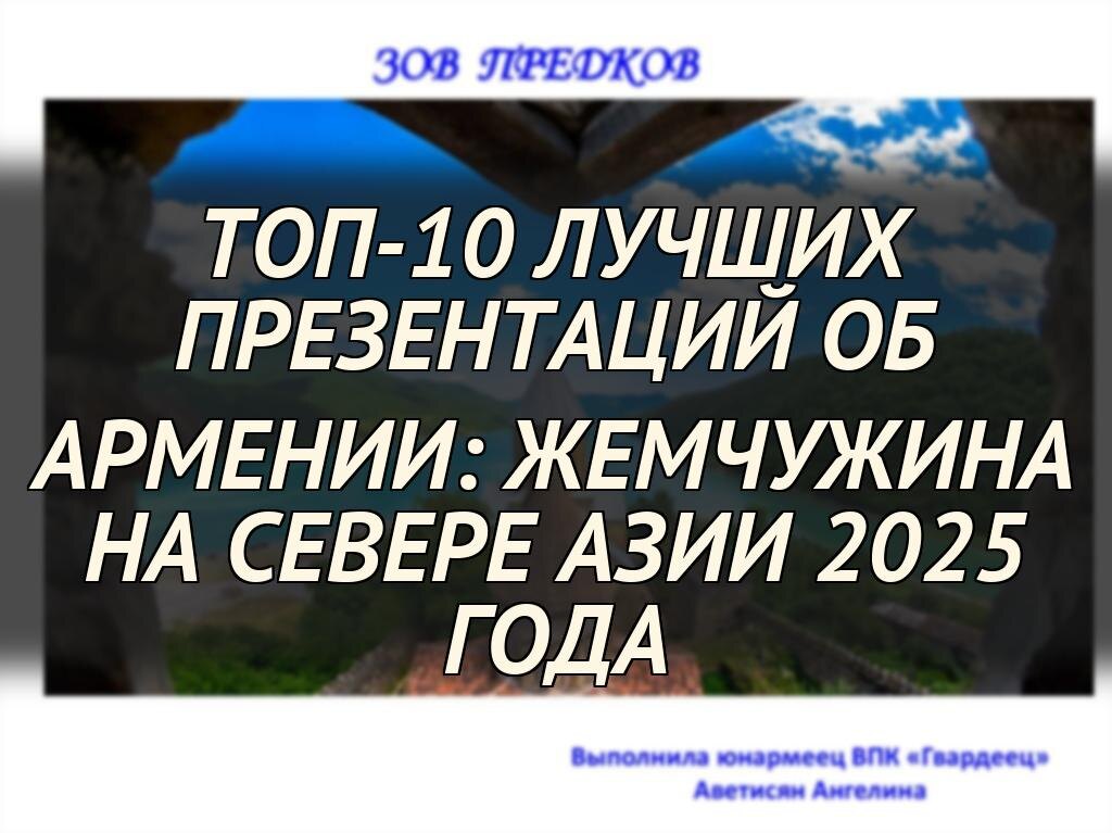 Презентация "ЗОВ ПРЕДКОВ", подготовленная юнармейцем Ангелиной Аветисян, знакомит с историей и культурой Армении, расположенной на перекрестке Европы и Азии. Страна, будучи одной из древнейших христианских наций, хранит богатое наследие, включая такие памятники, как храм Гарни, Эчмиадзинский собор IV века и монастырь Хор-Вирап у подножия горы Арарат. Презентация иллюстрируется изображениями этих мест, а также символикой Армении: гербом и флагом, где красный цвет олицетворяет борьбу за существование и веру, синий — стремление к миру, а оранжевый — созидательный талант народа.