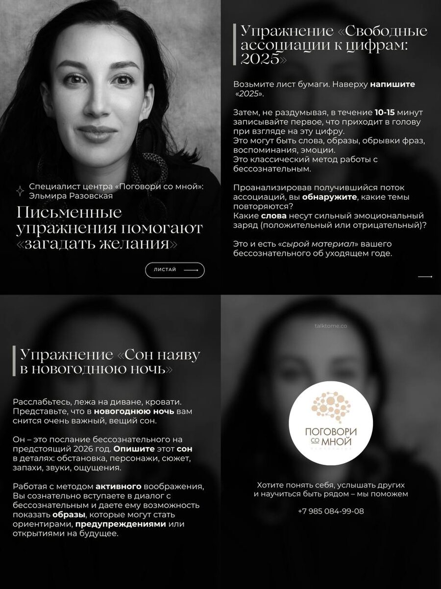 Как работать с упражнениями?👇 🟣Выделите время и пространство. Найдите 1–2 часа тишины: без людей, отвлекающих факторов и спешки. 🔘Пишите от руки. Связь «рука – мозг» активнее включает бессознательные процессы и помогает глубже погрузиться в себя. 🟣Отключите внутреннего критика. Записывайте всё, что приходит в голову. Здесь нет «правильно», «красиво» или «логично». 🔘Проанализируйте написанное позже. Через день-два перечитайте текст. Что вас удивляет? Что повторяется? Какие инсайты появляются? 🟣Не стремитесь к результату. Сам процесс такого письма уже является полноценным терапевтическим актом. Если вам нужна помощь или поддержка – обращайтесь к нам❤️ 📞 +7 985 084-99-08