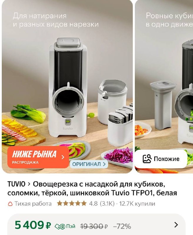 Шинкует кубиками‼️(см фото отзывов) Это же так удобно 🧼 Купили более 12К Оценка 4.8 Овощерезка с насадкой для кубиков, соломки, тёркой, шинковкой Tuvio TFP01, белая https://market.yandex.ru/cc/8FXbuP ✅ Канал по скидкам 🔣 Бот с промокодами