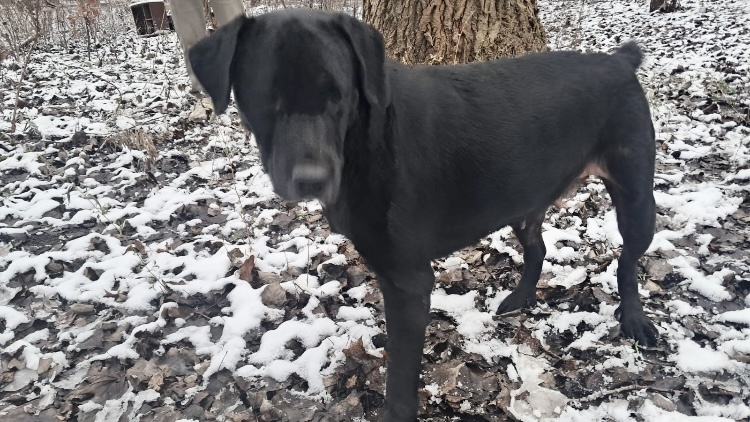 Лабрадор, это девочка, привязана к дереву во дворе. У неё странно купирован хвост. Возраст примерно 1,5 года. Соседи утверждали. что собака по вечерам часто скулила, прямо до боли.