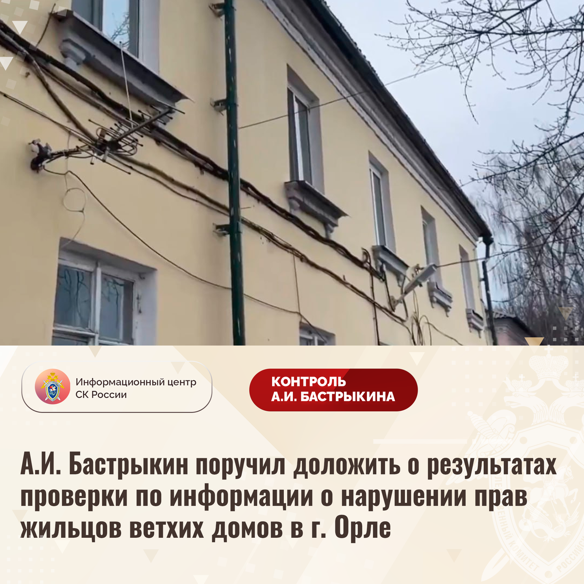 А.И. Бастрыкин поручил доложить о результатах проверки по информации о нарушении прав жильцов ветхих домов в г. Орле В сети Интернет сообщается о нарушении прав жильцов многоквартирных домов на Карачевском шоссе в городе Орле. Несмотря на проведенный в 2021 году капитальный ремонт, строения 1957 года постройки находятся в непригодном для проживания состоянии: несущие конструкции разрушаются, в стенах образовались трещины, из-за сырости штукатурное покрытие осыпается. Однако до настоящего времени здания аварийными не признаны, в предоставлении гражданам благоустроенного жилья отказано. Многочисленные обращения в уполномоченные органы результатов не принесли. В СУ СК России по Орловской области по данному факту организована процессуальная проверка. Председатель Следственного комитета Российской Федерации Александр Иванович Бастрыкин поручил руководителю СУ СК России по Орловской области Александру Николаевичу Полшакову представить доклад о предварительных и окончательных результатах пр