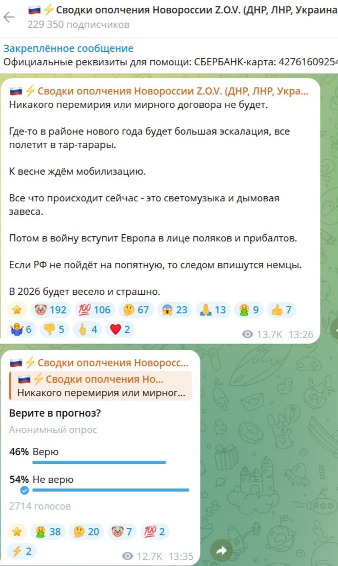 Опрос в 2700 голосов вполне репрезентативен, но нужно делать скидку на то, что ТК патриотической направленности, и готовых к эскалации войны побольше. 46% опрошенных верят в эскалацию войны на Украине с помощью поляков и прибалтов после Нового года. Я же повторю свою мысль, которую озвучивал после провала украинского «контрнаступления» ВСУ в Запорожье: ни один здравомыслящий западный военный не будет отправлять свои войска на отдаленный театр военных действий, где противник имеет преимущество. Момент, когда европейские войска, в каком-либо виде, могли бы поддержать успех ВСУ на фронте, уже упущен. Дальнейший ход развития событий буду описывать уже в прогнозе на 2026 год.