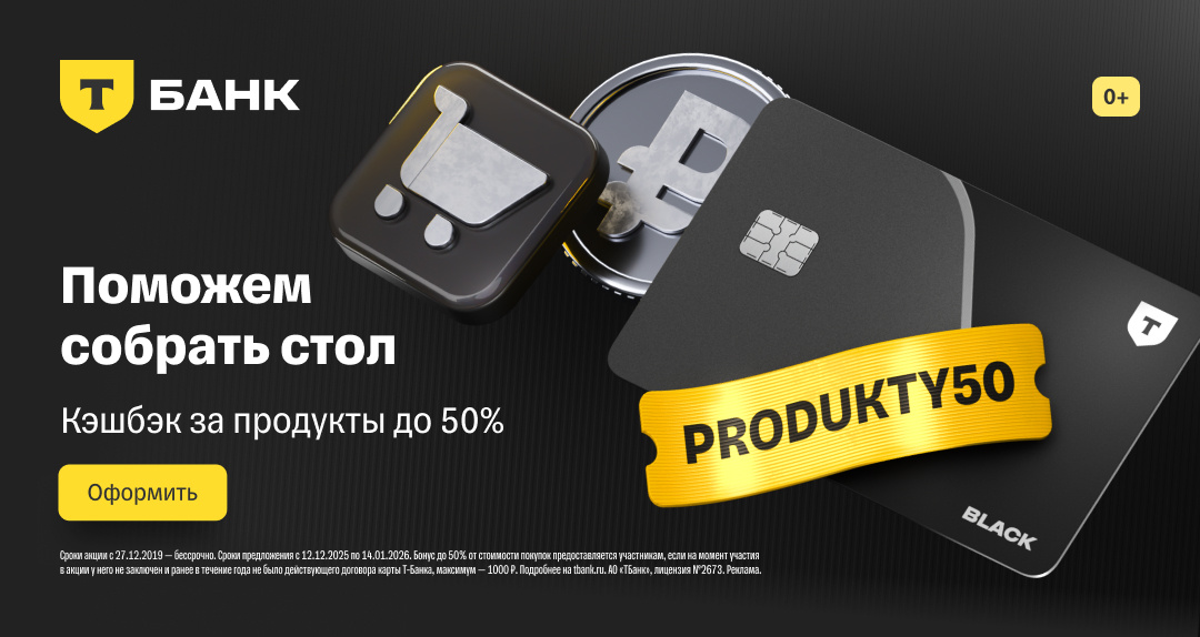 Акция с кэшбэком 50 % — отличный шанс сэкономить на продуктах и познакомиться с картой Black от Т‑Банка.