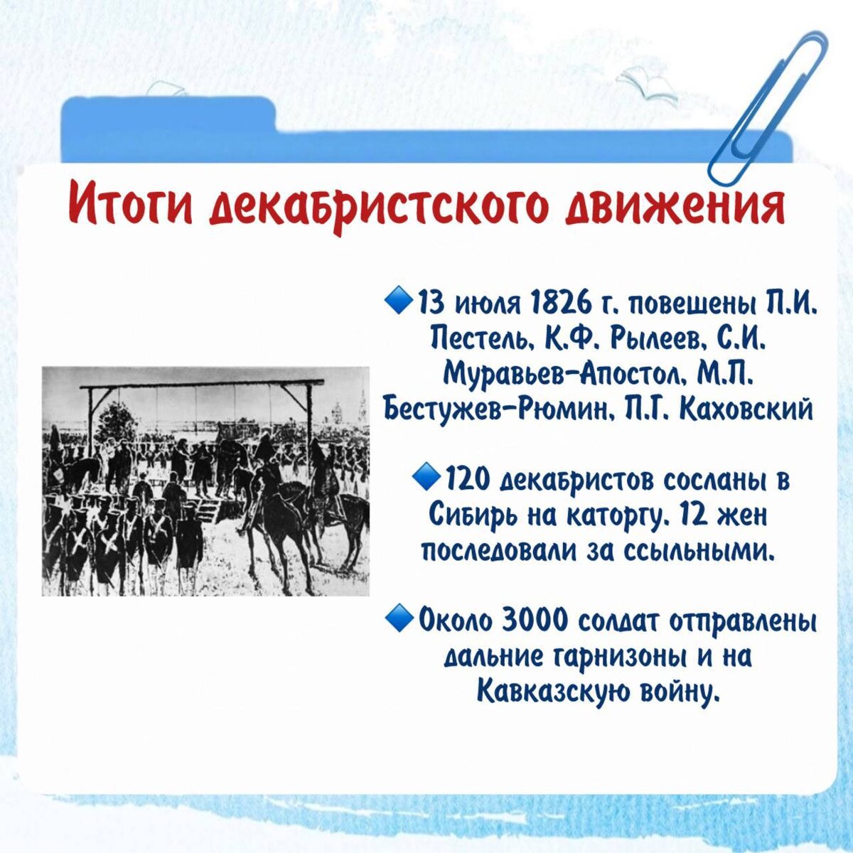 Итоги восстания декабристов найдете на карточке⏏️ Расскажу о причинах неудач. Это заготовка на 18 задание!!! ✔️ Отсутствие организованности. Отсутствие программы действий на разные варианты развития событий ✔️ «Диктатор» Трубецкой не явился на площадь ✔️ Непосвященность в планы декабристов, приведенных ими на площадь солдат, неучастие широких народных масс восстаний, безучастное наблюдение петербуржцев за происходящим ✔️ Присяга сенаторов Николаю І состоялась ранее ✔️ Пассивная тактика декабристов ✔️ Отсутствие связи с провинциальным офицерством. Историческое значение данного события: 🔹усиление мер по предотвращению заговоров и проведение реформ, чтобы смягчить кризис; 🔹пример для последующих революционеров. #полезноеистория