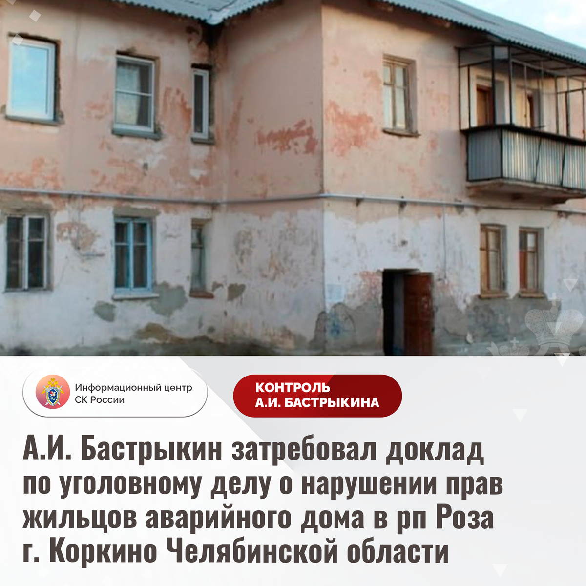 А.И. Бастрыкин затребовал доклад по уголовному делу о нарушении прав жильцов аварийного дома в рп Роза г. Коркино Челябинской области