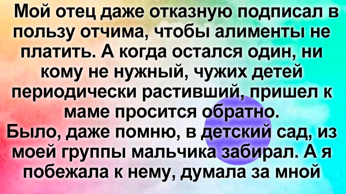 Мой отец даже отказную подписал в пользу отчима, чтобы алименты не платить. А когда остался один, ни кому не нужный, чужих детей периодически растивший, пришел к маме просится обратно.