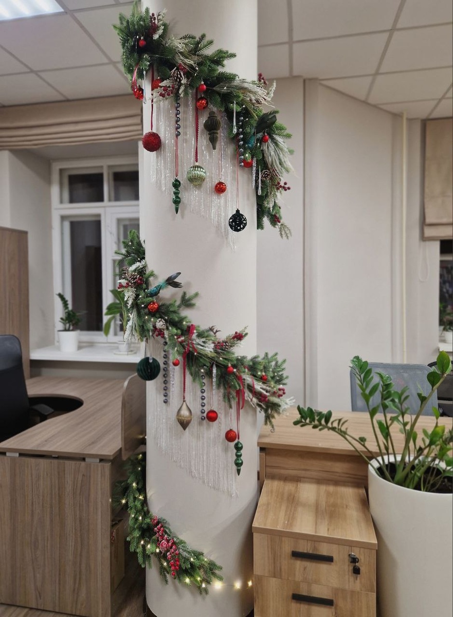О неудачах в работе не принято говорить, но как не рассказать, если они у нас случились?!🤩 Одним из таких стали несколько раз перемонтированные композиции на колоннах🤕 Вес тяжеленных литых хвойных гирлянд не выдерживали никакие крепежи, крючки и стяжки. И утром следующего дня я, как нашкодивший котёнок, ехала уже с главным монтажником в моей жизни - Кириллом Андреевичем - всё это демонтировать и переделывать👍 После третьего, уже более частого, приклеивания площадок большего размера под стяжки, использования десятка крючков (выдерживающих по 3 кг каждый), и дополнительного крепления к потолку, мы перекрестили эти столбы и попросили в следующий раз вызывать экзорциста 👹 До сих пор скрещиваю пальчики каждое утро и молюсь всем богам, чтобы привидения, живущие в этом здании (по рассказам самих же сотрудников), уже успокоились наконец-то и привыкли к этой красоте😈