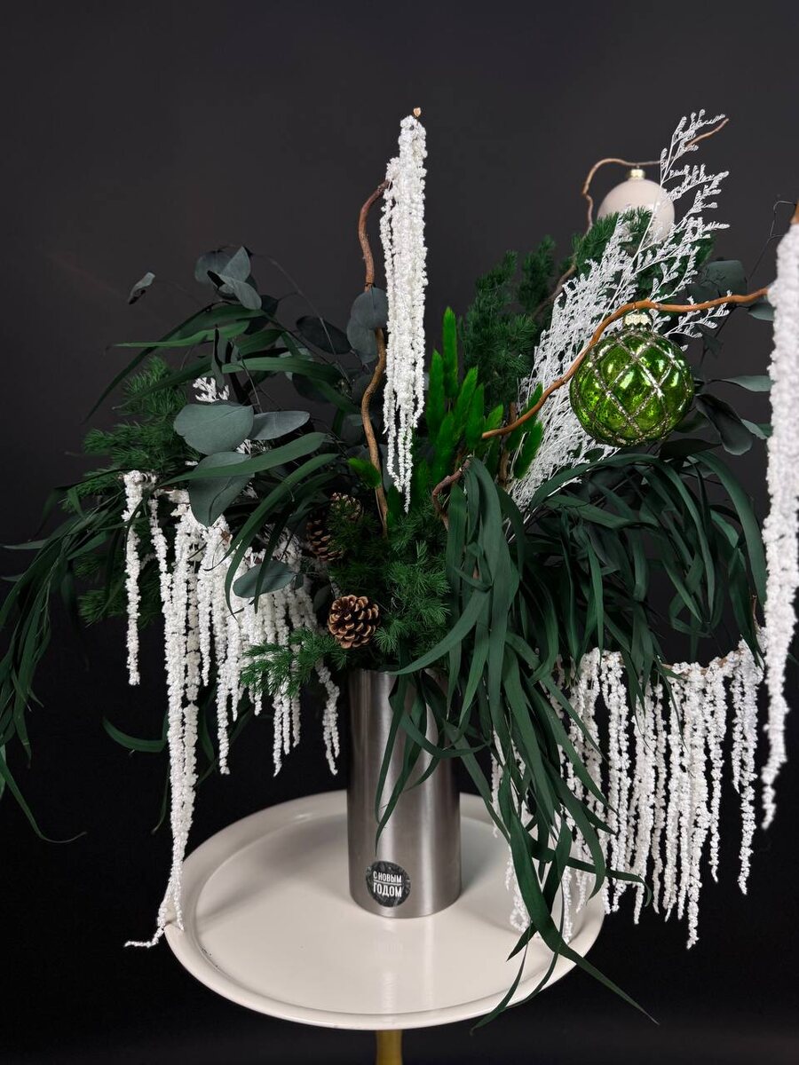 Наконец-то, накрыло и меня новогоднее настроение 🌲 Вчера на одном дыхании сделала универсальную композицию. Здесь и морозные узоры в виде веточек кермека, и сосульки в виде свисающего амаранта, эвкалипт насыщенного цвета, изумрудный дагурус и темно-зеленый аспарагус имитирующий хвою. А универсальна она потому что после нового года можно вынуть шишки и снять шар и готова интерьерная композиция🤗