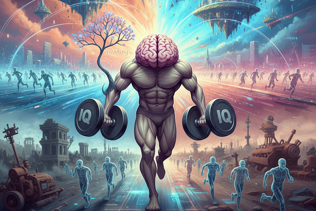 Представьте, что вы упорно качаете бицепс, пока мир готовится к марафону. Вы будете сильным, но бесполезным для забега. Именно это мы и делаем со своим мозгом в эпоху искусственного интеллекта. Мы пытаемся стать умнее, быстрее, продуктивнее. А спасти нас может только одно — умение создавать смысл.