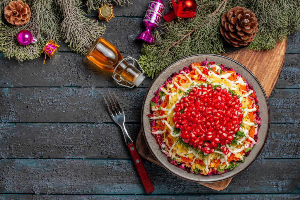 Вот 5 идей для новогодних салатов, которые выходят за рамки традиционных «Оливье» и «Селедки под шубой». Они сочетают в себе праздничный вид, интересные вкусы и часто готовятся быстрее классики. Идея: Элегантная и яркая интерпретация «шубы». Салат выкладывают в форме браслета, а главным акцентом становится зернистый гранат, символизирующий богатство и удачу.