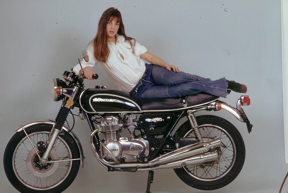 Муза французского певца Сержа Гинзбура, английская актриса, певица Джейн Биркин (род. 14 декабря 1946) позирует на мотоцикле. Актриса известна по фильмам «Смерть на Ниле», «Зло под солнцем» и других. В честь нее названа знаменитая сумка стоимостью от 9000 долларов.