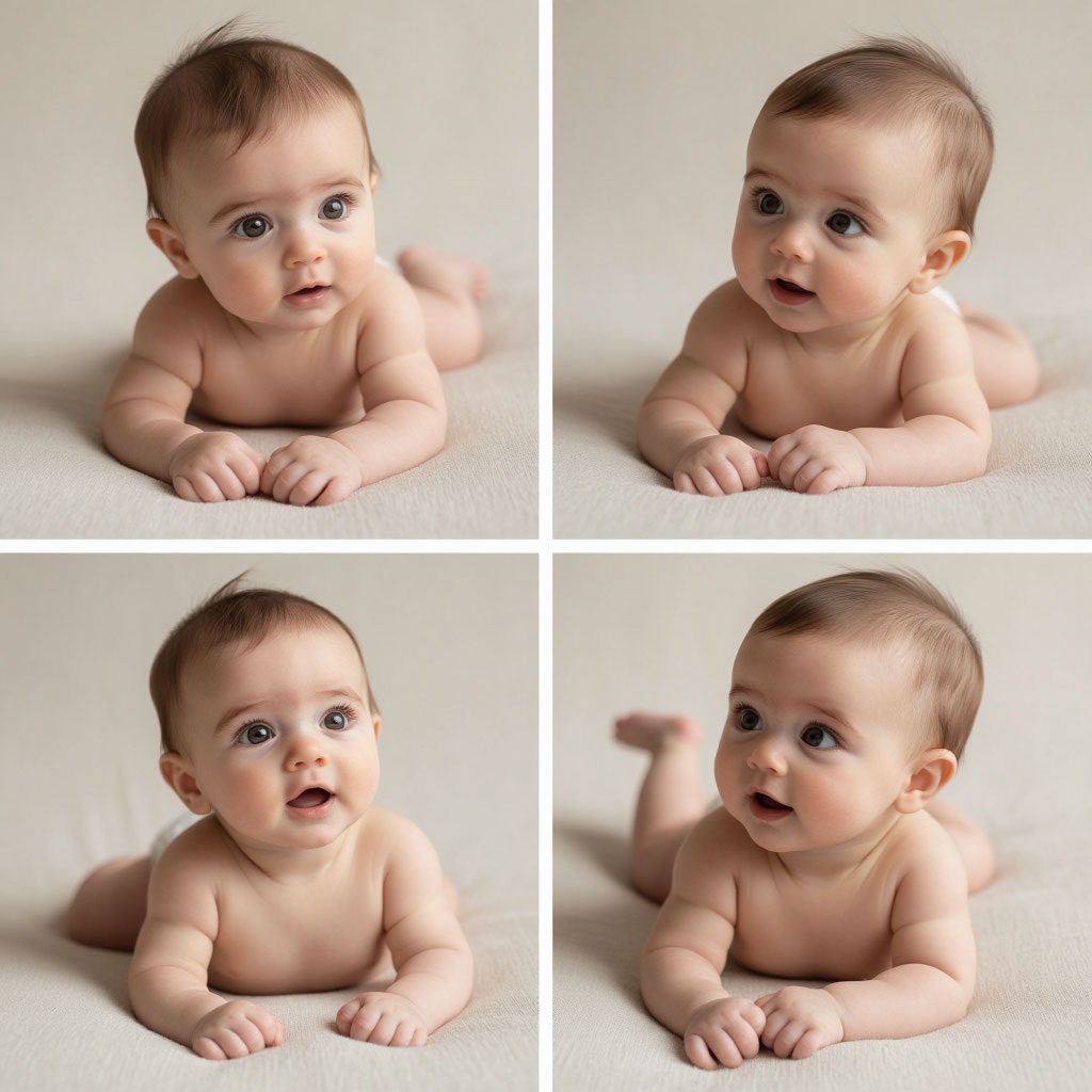 Лёжа на животе, ребёнок увереннее поднимает голову и удерживает её дольше — иногда до минуты. Он может опираться на предплечья, приподнимая грудь. Это важный этап укрепления мышц спины, шеи и плечевого пояса.