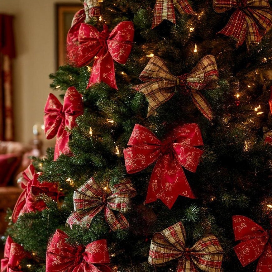 Чаще всего большие банты разных размеров используют для декора елки и венков, дверей — входных и межкомнатных, каминов, балконных и лестничных ограждений, коробок с подарками. Также их можно разместить на верхушке вместо звезды или собрать в эффектную гирлянду.