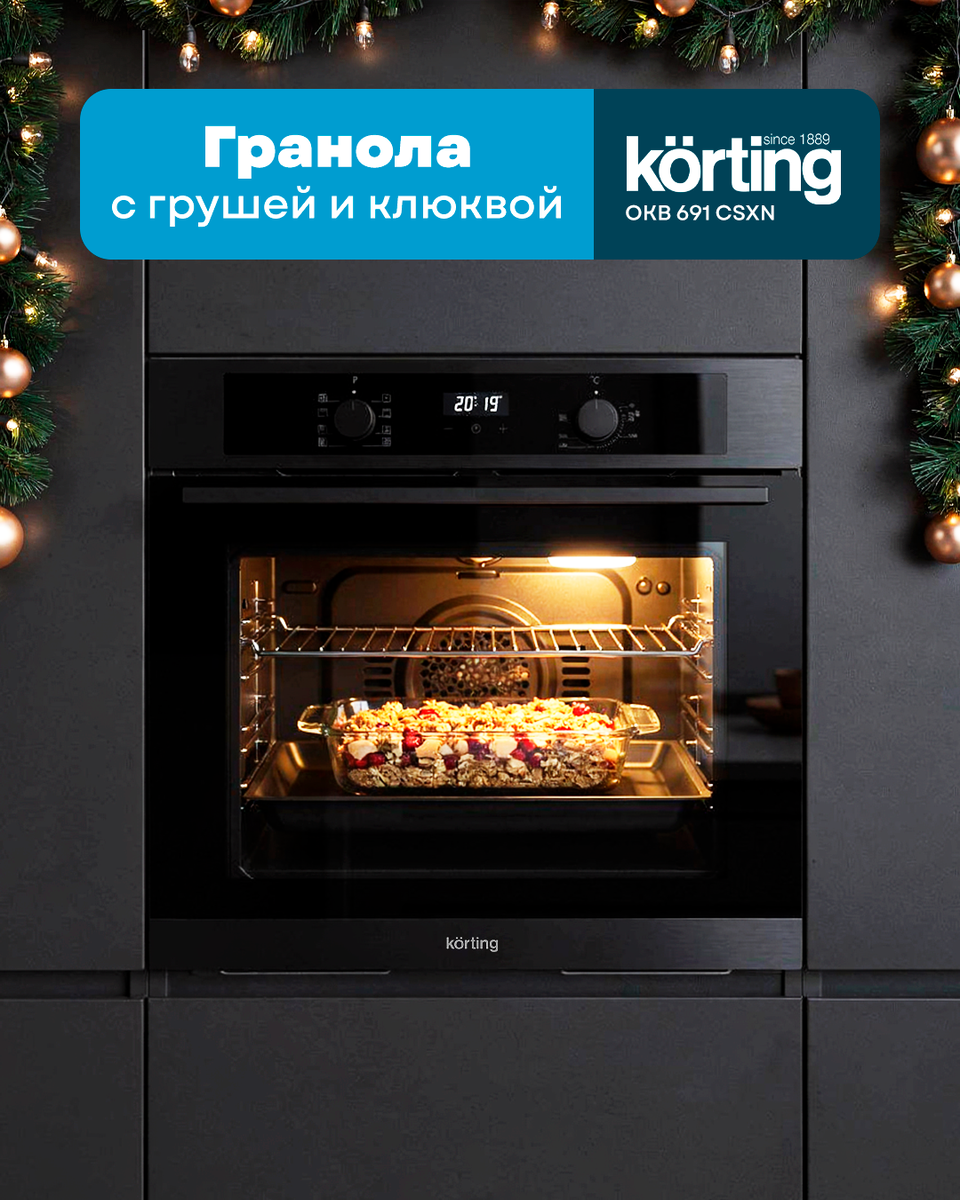 Запечённая грушево-клюквенная гранола сочетает нежную сладость спелой груши с яркой кислинкой клюквы, а хрустящие овсяные хлопья, пропитанные мёдом, придают ей насыщенную текстуру и глубокий медовый вкус. Ингредиенты: 🔹 Овсяные хлопья — 200 г 🔹 Груша — 200 г 🔹 Клюква — 80 г 🔹 Орехи — 60 г 🔹 Мёд — 70 г 🔹 Мука — 40 г 🔹 Растительное масло — 2 ст. л. 🔹 Корица — по вкусу 🔹 Соль — по вкусу Приготовление: 🥣 Смешайте овсяные хлопья, муку, орехи, мёд, масло, корицу, соль, грушу и клюкву до равномерного распределения ингредиентов. 🔥 Выложите массу в форму для запекания и отправьте в духовой шкаф Korting OKB 691 CSXN. Запекайте 30 минут при 170 °C , один раз перемешав гранолу в середине процесса. Затем полностью остудите до образования хруста. Узнать обо всех режимах духового шкафа вы можете по ссылке: https://clck.ru/3Qj3YY