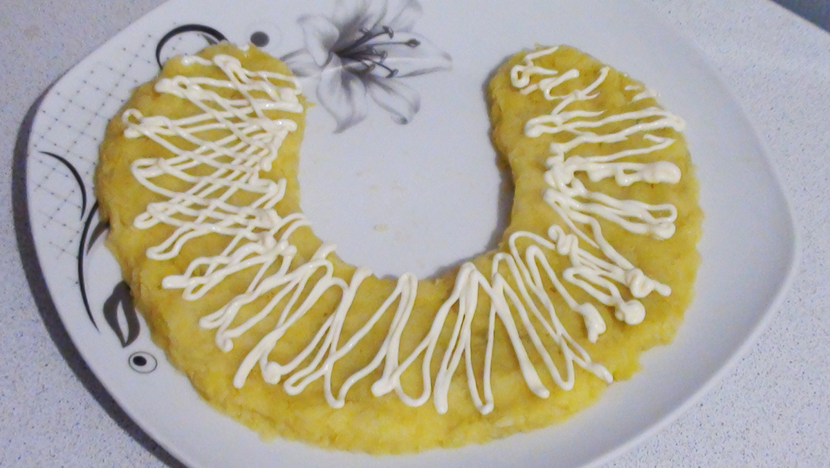 Простой, вкусный салат из доступных продуктов на праздничный стол! НАДО: картофель 2 шт. морковь 2 шт. сардины 1 банка лук 1 шт. яйца 2 шт. майонез зелень Картофель, моркови и яйца сварить, остудить, почистить. Лук покрошить кубиками, обдать кипятком чтобы убрать остроту и остудить. Картофель натереть на крупной тёрке и сформировать подкову, для удобства можно использовать стакан чтобы было ровнее. Делаем сеточку из майонеза. Следующий слой рыба, её укладываем кусочками, так вкуснее. Выкладываем лук. Морковь трём на мелкой тёрке и покрываем нашу подкову. Делаем майонезную сеточку. Следующий слой яйца, их тоже трём на мелкой тёрке. Украшаем салат зеленью и морковью. Такой салат станет украшением новогоднего стола!)