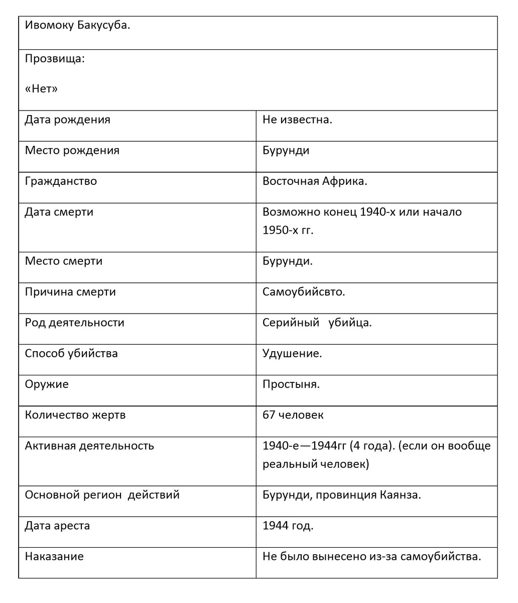 Восемьдесят шестое место в рейтинге самых плодотворных. Самая короткая статья из всех. Имя, годы жизни – Ивомоку Бакусуба. Страна - Руанда-Урунди. Годы убийств - 1940-е г. Кол-во. жертв (доказанное): 0 человек. Кол-во. жертв (предполагаемое): 67 человек . Краткая информация: Признался в убийстве 67 детей, которых задушил простыней. Покончил с собой в конце 1940-х или в начале 1950-х годов. Поскольку информация об этом серийном убийце была раскрыта сотрудником полиции только в 2018 году во время беседы с бразильским писателем, и нет никакой информации о его осуждении, утверждение о том, что Бакусуба был серийным убийцей, является спорным. Биографическая таблица: