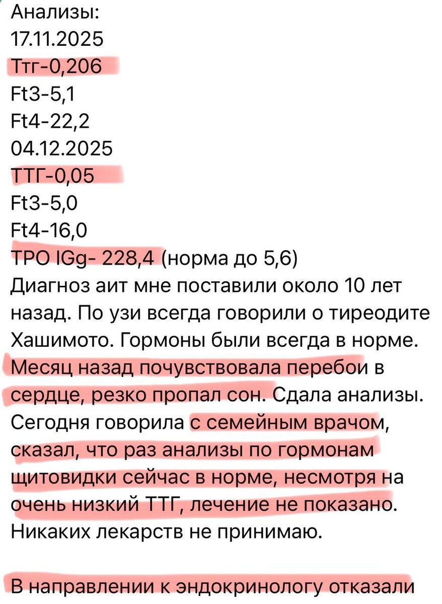 АИТ Печальная история с надеждой на хороший конец. Ко мне обратилась Елена. По анализам — АИТ (диагностировали 10 лет назад) и тиреотоксикоз. По симптомам — тиреотоксикоз с токсическим воздействием на сердечно-сосудистую систему. Семейный врач говорит: «Ваши гормоны в норме, лечение вам не показано, в направлении к эндокринологу отказано». Занавес. А всё почему? 1. Врач так себе, эти анализы НЕ В НОРМЕ 2.Тупая медицинская система лечит анализы, а не человека. Лечит цифры, а не помогает человеку, когда ему плохо. И когда же система возьмётся лечить Елену? Когда цифры в её анализах сойдутся так, что они подойдут под одну из схем назначения фармпрепаратов. Только в этом случае она сможет получить: — направление к эндокринологу, — от эндокринолога — схему фармпрепаратов. Идиотизм? Да. Но самое страшное, что это реальная жизнь. Елена принята ко мне в клуб и сразу будет зачислена в терапевтическую группу, где мы как раз и занимаемся системной терапией АИТ. То есть работаем не с цифр