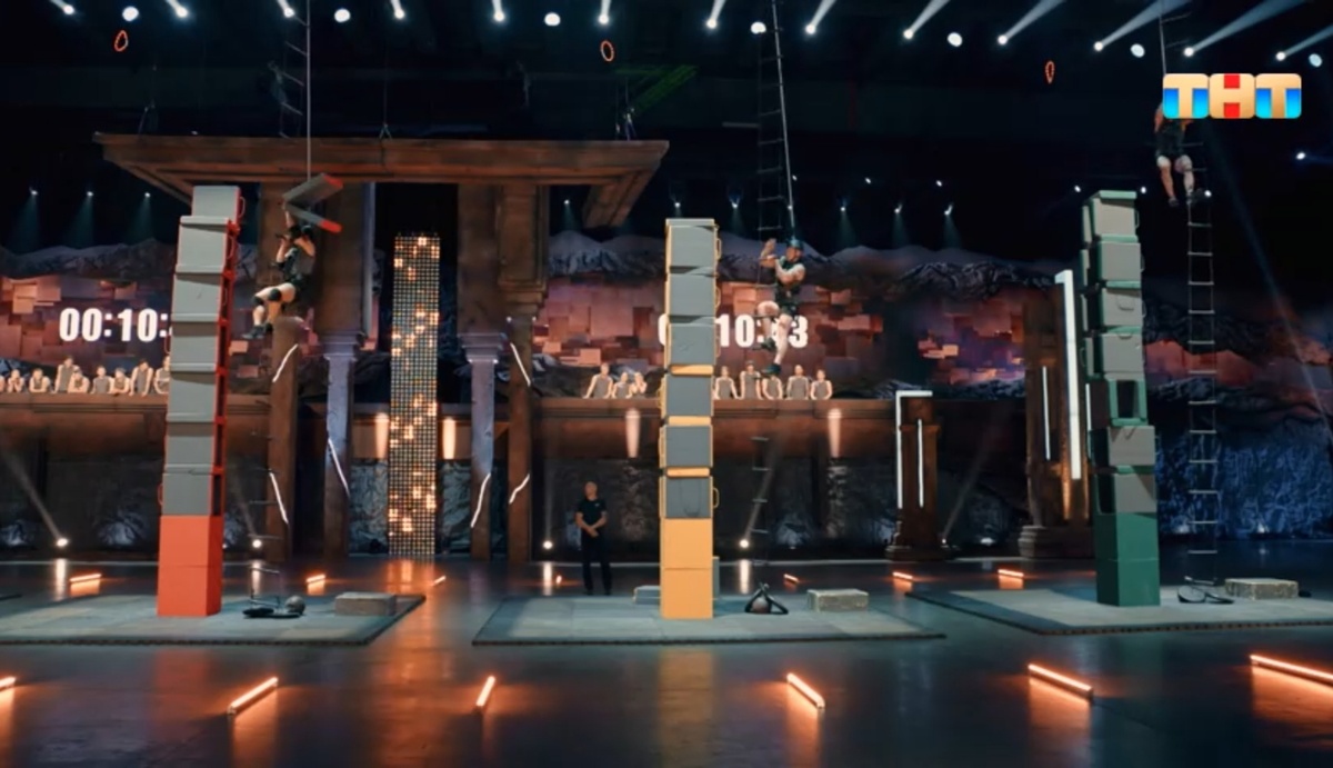 Задача атлетов – как можно быстрее построить башню из деталей одного цвета и достать светящееся кольцо, весящее на высоте 6 метров.