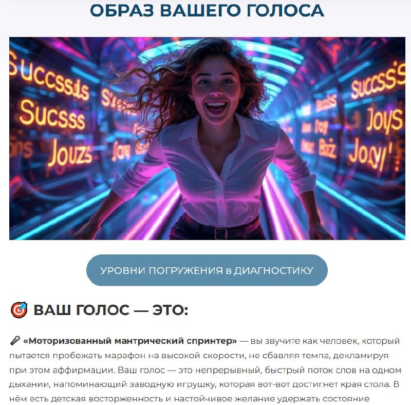 🎯 ВАШ ГОЛОС — ЭТО: 🎤 «Моторизованный мантрический спринтер» — вы звучите как человек, который пытается пробежать марафон на высокой скорости, не сбавляя темпа, декламируя при этом аффирмации. Ваш голос — это непрерывный, быстрый поток слов на одном дыхании, напоминающий заводную игрушку, которая вот-вот достигнет края стола. В нём есть детская восторженность и настойчивое желание удержать состояние радости, но при этом слышно лёгкое напряжение от того, что нужно «держать темп». ✅ КЛЮЧЕВЫЕ ИНСАЙТЫ: Сильные стороны: ✅ Невероятная устремлённость и фокус на позитиве: Ваш голос, как мощный пылесос, затягивает все темы в воронку позитивных намерений. Это похоже на человека, который в любой ситуации найдёт, за что зацепиться, чтобы двигаться вперёд.
