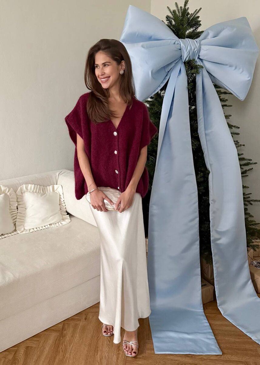 В копилку новогодних образов 🎀 Находка из новой коллекции — жилетка из мохера со сверкающими пуговицами. Примерили с шёлковой юбкой в жемчужном оттенке для полного праздничного наряда на новогоднюю ночь или корпоратив 💌