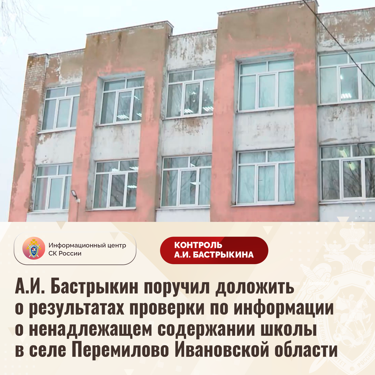 А.И. Бастрыкин поручил доложить о результатах проверки по информации о ненадлежащем содержании школы в селе Перемилово Ивановской области В СМИ сообщается о ненадлежащем содержании школы в селе Перемилово Ивановской области. Длительное время в период выпадения осадков кровля здания 1984 года постройки протекает, ввиду чего в учебных классах и других помещениях образовалась сырость. Кроме того, разрушается фасад строения, системы отопления и электроснабжения также нуждаются в замене. В результате дети находятся в небезопасных условиях. Несмотря на указанные нарушения, мер к организации ремонта учреждения не принимается. В СУ СК России по Ивановской области организована процессуальная проверка. Председатель Следственного комитета Российской Федерации Александр Иванович Бастрыкин поручил и.о. руководителя СУ СК России по Ивановской области Эдуарду Михайловичу Шалумову доложить о предварительных и окончательных результатах процессуальной проверки. Исполнение поручения, а также ход процес
