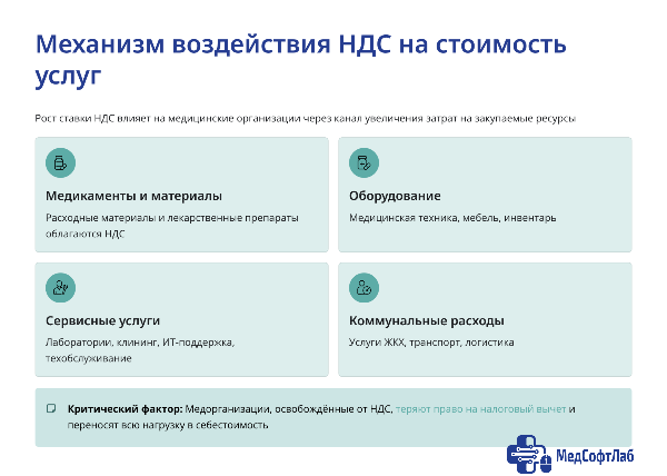 Рост ставки НДС воздействует на стоимость медицинских услуг прежде всего через канал увеличения затрат на закупаемые ресурсы. Даже при условии освобождения самой медицинской услуги от НДС значительная часть используемых для её оказания товаров и услуг облагается этим налогом: медикаменты и расходные материалы, медицинское оборудование, мебель и инвентарь, услуги сторонних лабораторий, клининговых и технических компаний, сервисное обслуживание аппаратуры, ИТ-поддержка, коммунальные услуги и транспорт.