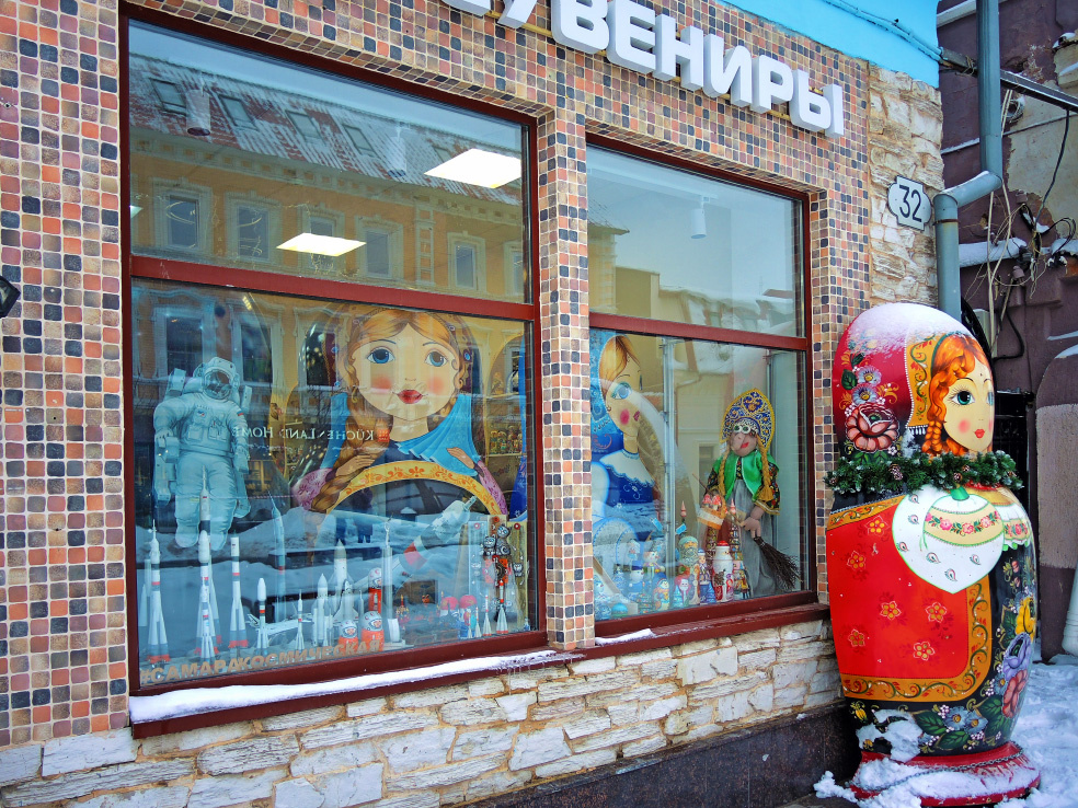 Зима в Самаре вроде бы начала начинаться. Можно уже переходить к новогодней теме. Нового пока ничего нет, сходил в архив и нашёл интересное, на мой взгляд, дополнение к прогулке по улице Ленинградской в декабре прошлого (2024) года. Главной целью тогда было праздничное оформление пешеходной части улицы. Но попутно на глаза попались несколько заведений, которые заодно тоже поснимал. Предлагаю посмотреть, что можно найти в этой части города туристу и прогуливающемуся местному жителю. Конечно, на пешеходной части, которая подразумевает поток туристов, работают сувенирные магазины разного масштаба. Есть небольшие лотки (которые теперь превратились в павильоны), где продаются авторские изделия. Есть более крупные магазины с широким выбором и ширпотреба, и эксклюзива. Один из таких магазинов расположен на первом этаже дома 32. Узнать его можно по матрёшке (половине матрёшки), которая стоит рядом с витриной. Внутрь заходить не стал. Подсмотрел через стекло. Почти напротив, в доме 33,